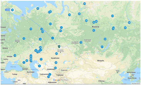 Table 2 gives information about PNEs’ distance (Δ°) and azimuth from BRVK and P-wave travel times (tp0 time of occurrence of primary body wave in solid earth after explosion origin time) to BRVK from [8], taking into account the time corrections (δT) of the digital registration stations [12]. PNE sites in Kazakhstan were visited in 2015, allowing GPS coordinates to be obtained in the field. The coordinates of 79 Peaceful Underground Explosions as a result of the analysis of satellite images (Google Earth images and a high resolution images was used from Geoportal Roscosmos), regional seismic data, and visits to epicenters (with radioactivity reports), are specified in [13]. PNEs locations after [13] are presented in Figure 1. Table 2 gives the following information about PNEs: (1) index number, (2) test name, (3) magnitude, calculated by body waves, mb, (4) date in Year‒Month‒Day format, (5) origin source time in hour:minute:second format, (6) geographical coordinates in degrees, (7) distance between source and BRVK in degrees (where 1 degree ≈ 111 km), (8) azimuth—angle between direction to the source and BRVK in degrees, (9) travel time tp0, registered at BRVK after time from row (5) in seconds, (10) instrument type [8]. The accuracy in geographical coordinate locations (row #6 in the table) differs because of the registration system and data quality. Bold type is used from [8], underlined text from IDG RAS database, plain type text from [13]. Refined PNEs locations are shown in Figure 2. All coordinates are available in KLM format in the Supplementary Materials.