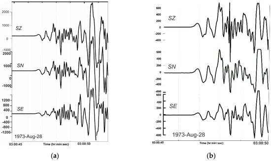 We show an example of seismic signals for Meridian-1 Test on 28 August 1973 (Figure 3). We mentioned that there were two registration systems, KOD and STsR, with different gain levels. In Figure 3a the KODm seismic station and in Figure 3b the STsR-SS seismic station data are shown. Both systems have spatially orientated components recorded at separate channels: SZ—vertical; SN, SE—horizontal.