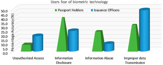 Despite the motivating progress in acquiring infrastructure for allowing the issuance of a biometric passport, this initiative can help facilitate faster clearance at the immigration border, guard against multiple passport issuance as well as protect against identity theft [4]. However, users’ concerns and fears, for example on disclosure of personal data and data abuse (misuse), remains a big research question. This is because a limited number of studies have explained biometric technology from the user concerns and acceptance perspective [5]. One such study found that most of the users feel worried, doubtful, or disturbance towards this technology since they regard it as a means for likely encroachments into their privacy. Understanding these users concerns as well as threats and attacks of technology is important. Individuals’ feelings and opinions may increase the risk of refusal and leads to biometrics application disappointment [6,7]. A study aiming to identify users’ distress and the knowledge gap of the biometric passport such as disclosure of personal data, improper data transmission, data abuse, as well as counterfeit and brute-force attack, is also likely to be a prerequisite for the development of a strategy to support the acceptance of such a ubiquitous novelty.