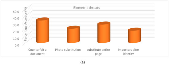 Furthermore, 21.2% presented threats related to photo substitution. Photo substitution is removing the biometric data image from the genuine individual’s document and exchanging it with an imposter’s biometric data image. Likewise, 18.2% revealed an imposters alteration of their identity as another threat, because the impostor can modify the biometric features to change the data in a genuine document to obtain high verification scores. For instance, modification of the biographical data in the optical or MRZ.