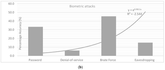 Additionally, attacks to the biometric template database were discussed. Foty-five-point-five percent (45.5%) of the respondents revealed brute force attack as the greatest vulnerability, because the imposter can attack the server system to acquire the biometric template database. Thirty-three-point-three percent (33.3%) showed password recovering, because an imposter can crack and recovers password from the stored system to access unauthorized files. Fifteen-point-two percent (15.2%) showed eavesdropping. Eavesdropping is where an invader clandestinely listens to the communiqué link and interrupts the message using digital devices such as the RFID chips. Six-point-one percent (6.1%) revealed denial-of-service. This is because an attacker tried to prevent genuine users from obtaining access to the server system. These exposures in the technology can permit an invader to remotely spy on a user’s information. Therefore, three-factor authentication is required to generate a pre-determined pin code to prevent an attacker from compromising an individual account. The findings of the analysis are presented in Figure 3a, b.