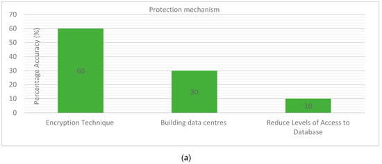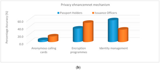 Despite the increasing attacks and threats to biometric technology, the best mechanisms to secure and enhance the privacy of the user’s information were discussed. The encryption techniques and encryption program were the recommended techniques with 60% and 51.5%, respectively. The encryption technique helped protect biometric private information and sensitive data and enhanced the security of the server’s communication. The respondents suggested the encryption program to enhance the privacy. This is because the encryption program binds the digital key to securely encrypt the sensitive biometric information. Then, the information is saved in the database that makes it harder for the imposter to break into. If this mechanism could be put in practice, then most of the respondents would be likely to apply for a biometric passport. Thirty percent recommended building data centers. Because the data center would provide centralized services. For instance, the data storage, the backup-recovery, and data management to run either online or offline. Fifty-eight-point-three percent (58.3%) and 33.3% commended identity management, because it facilitates role-based access control that would allow the system administrators to control and oversee access to the organization’s critical systems and guarantees access to the specific application for which they are authorized. Ten percent (10%) of the participant recommended reduction level of database access, because security is a significant issue in database management. We, therefore, recommend that civil policy for biometric data gathering and handling should be based on lawful ideologies and should include the input of diverse actors such as civil society organizations, industry associations, privacy-security experts, government officials, as well as intelligence expertise. The findings of the analysis are presented in Figure 4a,b.