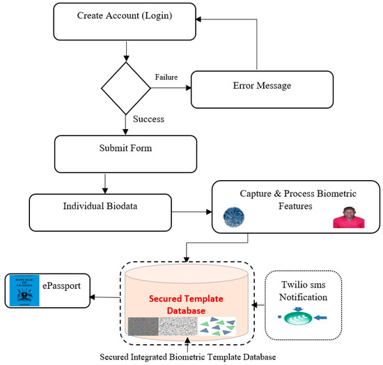 As biometric technologies are not designed fully with security or privacy capabilities, technology inventors need to address the provisions of the deployed application. The user populace needs to talk in the planning process to guarantee and reassure the end-user’s acceptance. Our proposed application system involved security tools such as Jinja2, Wtforms, Cryptography, and Twilio programmable sms among others. Jinja2 were used as a template engine that contained variables and tags to control the logic of the information flow. It provides a protection framework for automation of testing the application and helps prevent cross-site scripting (XSS) attacks. The Wtforms were used to generate a passport applicant’s form, instead of writing Hypertext Markup Language (HTML) directly. This provided protection from Cross Site Reference Forgery (CSRF) through Wtforms CSRF module. The cryptography modules were used to encrypt the face scan and the fingerprint image based on Fernet instance. The Fernet ensured that the message encrypted would not be read lacking the key. The Twilio programmable sms was used to alert users and authority through sms messages in case of unauthorized access to the system and the database template of the application. With these security tools implemented, we were able to address users’ concerns of privacy and security of the biometric information. Of the concerned addressed were, the passport was issued by the correct person who applied and followed the procedures. The individual information was secured and encrypted with Twilio sms notification that assured the person of his/her information safety. Two encrypted files were produced that make it computationally complex for any impostor to break into the template database server to access any individual data. The digital data on the passport were only readable by an authorized officer. The application could detect, monitor, signal, and report illegal attempts of the template database linkage. The proposed system provided faster, more reliable and easier processing of biometric documents. The system was able to control the individual information and provided feedback immediately as well as increased accuracy and efficiency. The system was able to reduce fraud and forgery of documents. Thus, it could build public acceptance, confidence and trust in the system itself and in those operating the applications. The proposed framework for the biometric passport application system is presented in Figure 5.