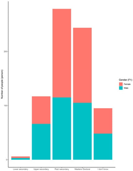 The question of academic expectation asks about the highest expected education level. The responses were encoded as variable ‘F6’. Statistics show that the majority of students wished to complete post-secondary (36%) and masters/doctoral level (33.5%). Distributions of responses to F6 by gender can be found in Figure 1.