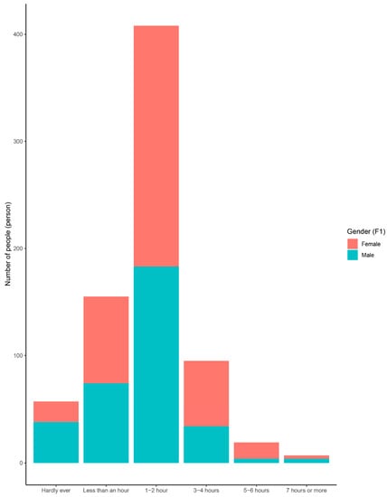 Figure 2 depicts the distribution of values for variable ‘G14’ about the amount of time spent online or using computer by gender. The horizontal axis refers to the provided different time lengths. The blue columns represent the number of female students, and the red columns represent the number of male students. It can be seen that a large number of students spent between one and two hours online for personal study purposes (55%). It also seems that female students preferred spending more hours online or using a computer than their male counterparts.