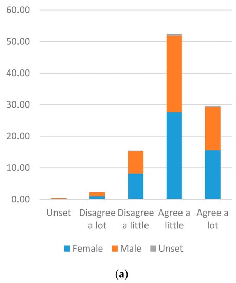 The Creativity and Innovation domain contains 11 questions measuring students’ ability to develop creative digital products and present oneself in the digital world. Figure 7a suggests that most of the responses have the value of “disagree a little”. This means that the majority of surveyors were slightly doubtful of their originality and creativeness in manipulating digital resources on online platforms.