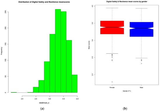 (a) Histogram of mean scores and (b) Box plot of mean scores by gender in the Digital Safety and Resilience domain.
