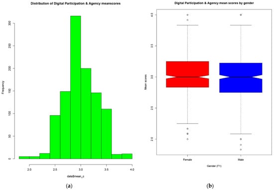 (a) Histogram of mean scores and (b) Box plot of mean scores by gender in the Digital Participation and Agency domain.