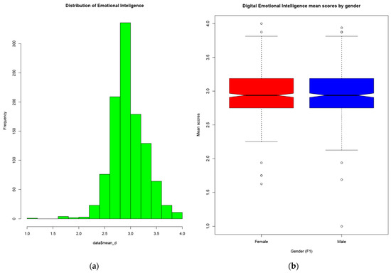 (a) Histogram of mean scores and (b) Box plot of mean scores by gender in the Digital Emotional Intelligence domain.