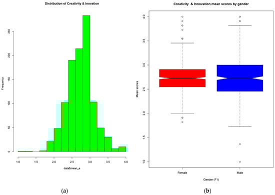 (a) Histogram of mean scores and (b) Box plot of mean scores by gender in the Creativity and Innovation domain.