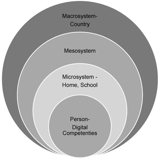 This research is theoretically based on Bronfenbrenner’s bio-ecological model, which describes a child’s maturity in interactions with multiple levels of sociodemographic, cultural, and societal elements that constitute his or her community [18]. In particular, the model proposes four layers of the environment with a respective impact on a child’s cognitive growth.