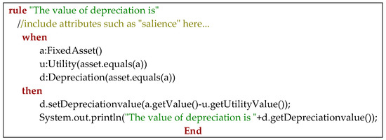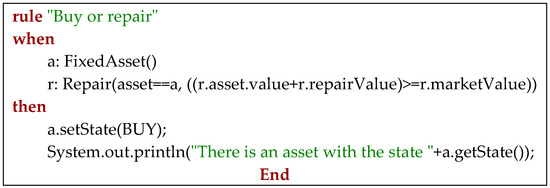 The output is “The value of depreciation is −5000.0”. We notice that the depreciation value was inferred by the Drools rule “The value of depreciation is”. If we decide to define another rule that establishes that the utility value is equal to the market value, we will be able to infer the state of the fixed asset. The main concepts from our domain model are those from the class diagram, namely: FixedAsset, Utility, Repair, and Depreciation. By inferring rules, we were able to set the state of an asset, and after that, we were able to query the knowledge base about the fixed assets list.