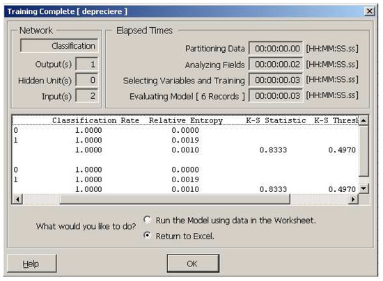 In the absence of such sources of information, appreciation can be made from historical data about assets that are part of the same asset class and that have once been depreciated. Because it is not a trend set of values, we cannot talk about an estimation based on statistical methods. The best solution is to use a neural classification network. The training set must consist of the input values for asset returns and the output values (0 for underestimated and 1 for depreciation). In Figure 5 we present the realization of such a neural network.