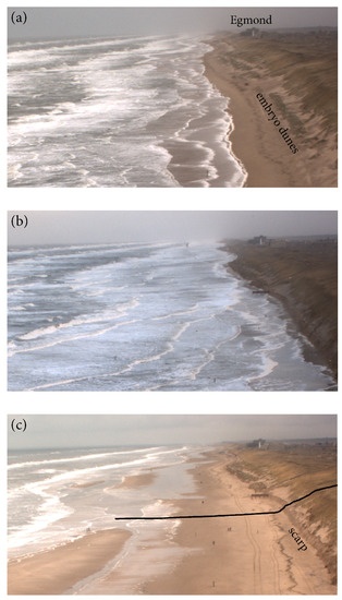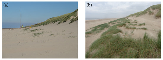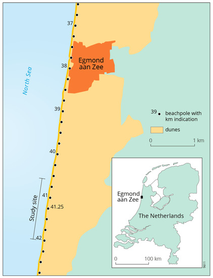 Egmond aan Zee is located on the approximately 120-km long, uninterrupted, North–South oriented Dutch Holland coast (Figure 1). It faces the semi-enclosed North Sea and is a microtidal, storm-wave dominated site. The annual mean offshore significant wave height and period are about 1.3 m and 4.5 s, respectively. During winter, the monthly mean is substantially higher than in summer (1.8 versus 0.9 m) [30]. During northwesterly storms, can increase to over 7 m. The tide is semi-diurnal, with a neap and spring tidal range of approximately 1.4 and 1.8 m, respectively. Storm surges can raise the water level by more than 1 m, especially when the wind is from the northwesterly to northerly directions. The most frequent winds are, however, from the southwest. The gently (≈1:40) sloping intertidal beach often contains 1 or 2 slipface ridges [31]. Landward of the high-tide level, the profile becomes steeper, and at an elevation of around 3 m above mean sea level (MSL), it changes into the steep (1:2.5) front face of the foredune. At 14 to 17 m + MSL, the profile shows an abrupt change in slope and continues gently to the foredune crest at a height of 20 to 25 m + MSL. Especially this latter, more gently sloping part of the foredune is densely covered in European marram grass (Ammophila arenaria). The steep foredune slope has resulted from earlier dune erosion events, with the change in slope marking the location to which the foredune eroded by means of rotational failure [7]. Alongshore variability in foredune shape and height is small. During multiple years without dune erosion, embryo dunes can develop at the toe of the foredune [7]. The well-sorted quartz sand at the study site has a medium grain size of 250–300 µm, with a tendency to decrease in the landward direction.