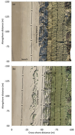 Orthophoto of a small part of the study area ( m, m) for (a) 12 December 2013 and (b) 16 October 2017, with superimposed elevation z contours. North is upward. In (a), the contours on the beach and the eroded foredune are based on the 12 December 2013 MLS DEM (#4 in Table 1), while the more landward contours are based on the 18 January 2014 ALS DEM (#5). As mentioned in Section 3.1.2, MLS DEMs do not contain elevations landward of the steep, seaward facing slope of the foredune because of shadowing. Therefore, the ALS contours were added here for completeness. The contours in (b) are all based on the 16 October 2017 UAV-SfM DEM (#30).