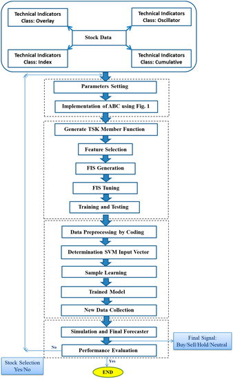 Figure 4 illustrates the architecture of the presented model for the stock price forecasting. This figure shows that the ABC and ANFIS modules have been employed to multi-objective optimization of technical indicators, and the SVM module has been used to produce trading signals (Buy/Sale/Hold/Neutral).