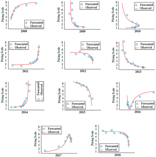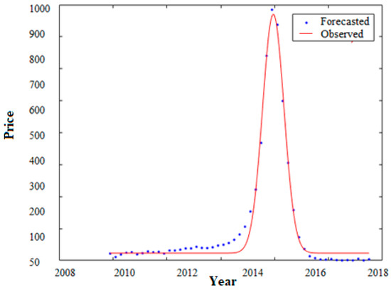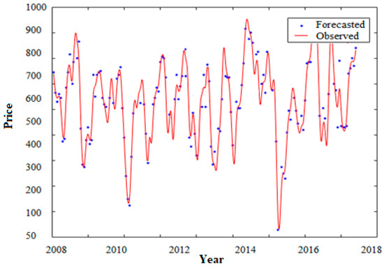 Figure 6 illustrates the performance evaluation of ABC-ANFIS-SVM that corroborates the best performance. The forecasted prices approximately correspond with the trend of the observed prices.