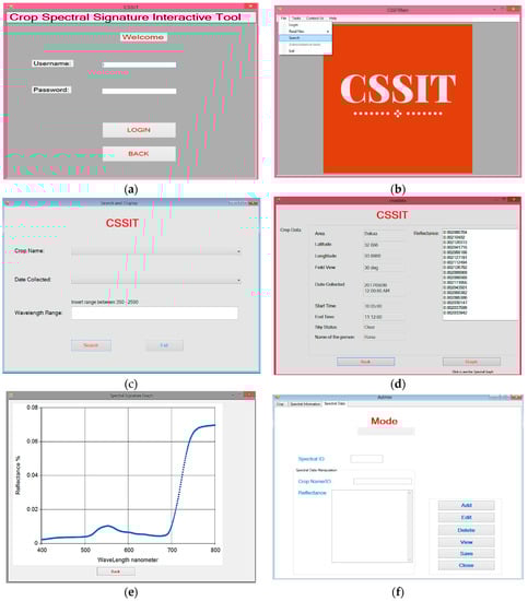 As can be seen from the above figures when the application is launched, it requests authorization in order to allow the user to access its database and other existing functions and features. After gaining access to the application (CSSIT), the guest user can select search item from the main interface window to launch the search dialog box. After searching for a specific crop and date of collection, one can either display the metadata of the crop or/and display the graph of the crop’s spectral signature. If the user is authorized as an administrator then the tasks dialog box can be displayed to add, edit, or remove records. Finally, although the application does not allow complete access for guest or normal authorized users, in the future when it is deployed on the Web more features will be added such as a feedback and suggestions dialog box. A copy of the main application CSSIT under the name “setup.zip” is made available with this research paper in Supplementary Materials. The database is not included, but an update of the application may be provided to the journal in the near future.