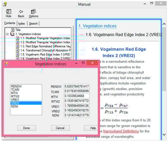 More than 150 VIs have been published in scientific literature, but only a small subset have substantial biophysical basis or have been systematically tested [25]. The VIs are normally divided into several categories depending on their use. However, the most known categories are the broadband and narrowband VIs [26]. Because we are using very high resolution spectral data, it has been decided that some narrow band VIs can be used in CSSIT. Examples of what VIs can be calculated using CSSIT (Figure 5) are the red edge normalized difference vegetation index (RENDVI) (Equation (3)) [27] and the narrow bands (hyperspectral) normalized difference nitrogen index (NDNI) [28]. This index is designed to estimate the relative amounts of nitrogen contained in vegetation canopies (Equation (4)).