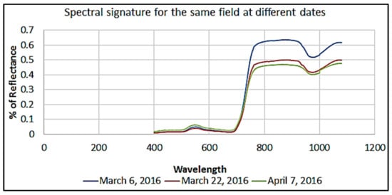 Based on intensive field work, taking 3 to 5 samples per field is recommended where each sample represents a plot in a field crop with an area size equal to at least one hectare. The surveys should account for different natural and environmental conditions such as soil type, soil temperature, vegetation temperature, climate conditions, and topography. Regarding the time of data acquisition, the field spectroscopy protocols [23] recommend that the measurement time must be as close as possible to solar noon. In our case, most of the field work is done between 10:30 in the morning and 2:30 in the afternoon. It is important that in order to create unique and measureable spectral signatures for crops, spectral signatures databases must consider the spatiotemporal changeability of the vegetation. Field surveys should be done on different phenological cycles for each crop and to detect differences in LAI, CHC, and other physiochemical parameters that can help distinguish between different crops and to create unique signature for specific crop. In our case and depending on the climate conditions, the trips are conducted once every week such that each week a different area is visited and surveyed. This pattern of visits helps in covering a large area of study in one month or less. The same procedure is repeated and completed before harvesting of the crops. The total number of collected spectral signatures after quality check was large enough (>100), which helped in understanding the phenology of each studied crop. Sometimes, spectral signatures are collected for non-crop bodies such as soil, water, and others.