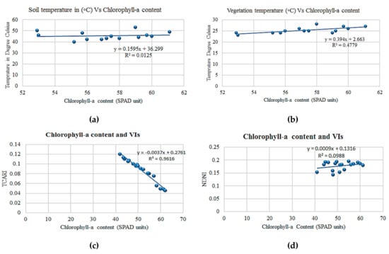 Chlorophyll-a content in relationship to (a) soil temperature, (b) vegetation temperature, (c) TCARI, and (d) NDNI.