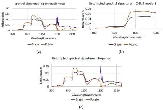 Spectral signatures. (a) Spectroradiometer, (b) resampled to CHRIS-Proba, and (c) resampled to Hyperion.