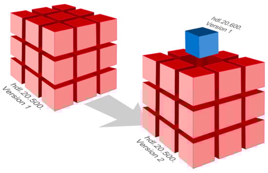 Schematic draft of subset needs, which includes the control on versioning and the alignment with the persistent identifier (PID), here handle.NET identifier—hdl. For the fragmented subset (blue cube), a new identifier is aligned, coupled with its own version number.