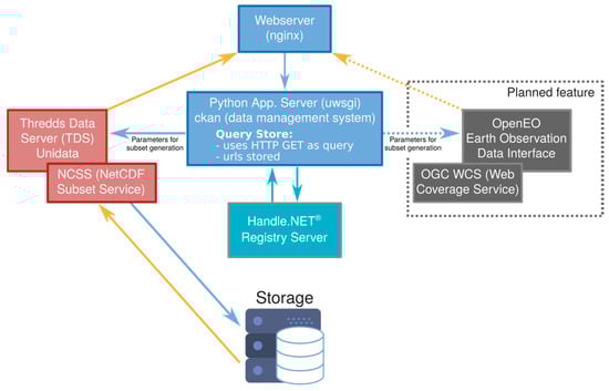 Figure 3 illustrates the implemented components and gives an overview about the relationships between requests (blue arrows) and responses (orange arrows) between the server. The application server takes the requests via the Web server and generates URL-based (HTTP GET) requests with the subsetting parameters (subset requests). These requests are stored in the query store and are assigned with the Handle identifier.