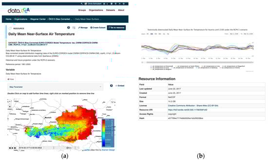This pilot implementation on Dynamic Data Citation at the CCCA Data Centre focused on CF standard [] compliant NetCDF data to manage high-resolution climate scenarios for Austria in a time range from 1965 until 2100. NetCDF is an open standard and machine-independent data format for structured and multidimensional data. It includes attributes, dimensions, and variables. For example, for the Austrian Climate Scenarios, calculated temperature records on daily basis are available in 1 × 1 km gridded, geo-referenced data in multiple single files. The scenarios include different “representative concentration pathways” (RCPs) [], ensembles of different GCM (general circulation models) and RCM (regional climate model) runs, for high-resolution conclusions, which are combined with statistical methods for the integration of in situ observations. The open accessible entire data package includes, for Austria, over 1200 files with a size up to 16 GB per file. Due to user requirements, in particular for the development of data-driven climate services and the characteristics of the climate scenarios provided, a subset service, Figure 2, was required.