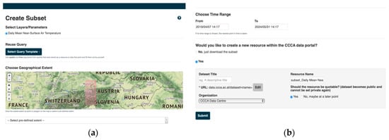GUI of the subset creation function: (a) The upper part of web page for defining the parameter, or reuse of a still existing query, defining a bounding box either by polygon or predefined administrative units, (b) allows choosing a time range for other datasets like the globally available radio occultation data packages, a fourth dimension—e.g., the Potential High was introduced and can choose.