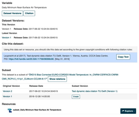 With data-driven web services, the data used are not always static, especially in collaborative iteration and creation cycles []. This is particularly valid for climatological research, where different data sources and models serve as input for new data as derivatives, e.g., climate indices like calculation of the number of tropical nights, which is based on different climate model ensembles. From a data quality point of view, it is preferable that such derivatives also be affected and updated automatically by the performed correction chain. Such changes in consideration on dependencies in data creation should be communicated as automatically as possible. A research data infrastructure should be able to provide an environment for dynamic data. With the reproducibility of results in mind, it is essential to be able to accurately verify a particular dataset, its exact version, or the creation of data fragments. The reproducibility of the data fragments and their relationship to their originals is essential if data processing has to be repeated.