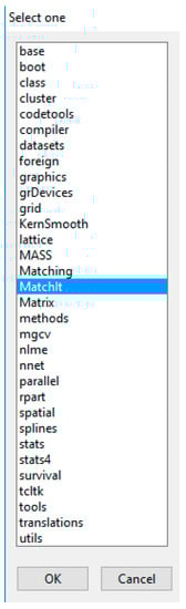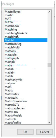 To install the MatchIt package, open R and select Packages > Install Package(s). A “Secure CRAN mirrors” list will pop up, as is shown in Figure 1. Select the site you prefer and click “OK”. Select Package > Install Package(s), then a new window will pop up (Figure 2). Select MatchIt and click “OK”. The package will be installed immediately. Next, click Packages > Load Package, and a new window will pop up (Figure 3). Select MatchIt and click “OK”. The package will then be loaded. MatchIt CRAN information can be referred to the website https://cran.r-project.org/web/packages/MatchIt/index.html [].
