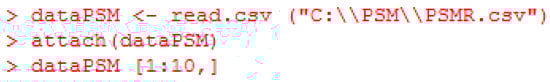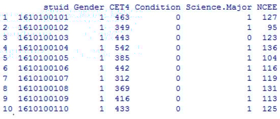 In order to do PSM, the data layout should be formatted so that each case is listed in a row, and the variable is listed in each column, as is shown in Figure 4. PSM matching requires at least one grouping variable (e.g., condition) and one or more matching variables. In this study, we have two conditions, treatment (coded as 1) and control (coded as 0). We also have three matching variables: gender (male coded as 1, female coded as 0), major (science coded as 1, art coded as 0), and NCEE scores (continuous). In this study, we used the basic format of a comma-separated values (CSV) file. R is also compatible with other data formats, such as Excel and SPSS. You can drag the file from the folder into the R Console to get the location of the file. When importing data into R, we need to ensure that there are no missing values. In this study, our sample included 3549 university students who were admitted to University H in 2016, with 110 students being enrolled in the ET program. Those 110 students were regrouped into three classes taught by three teachers. To avoid instructor effect on the outcome, we randomly selected one ET class for PSM procedure and comparison analysis. After removing the missing values, we ended up with an analytical sample of 3373 in the control and 36 in the treatment conditions used in the PSM analysis. The file imported into R is named “PSMR.csv” and saved in the PSM folder on the C drive. The code “dataPSM <- read.csv (“C:\\PSM\\PSMR.csv”)” in Figure 5 is the code for reading the data in PSMR.csv and renaming it dataPSM. The second line in Figure 5 (“attach(dataPSM)”) is the code for making the file available in R. The third line in Figure 5 (“dataPSM [1:10]”) is the code for showing the first 10 students’ data, which is demonstrated in Figure 6.