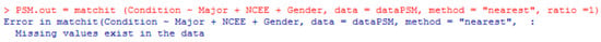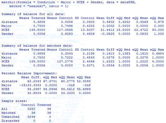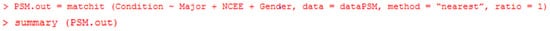 The code “PSM.out = matchit (Condition ~ Major + NCEE + Gender, data = dataPSM, method = “nearest”, ratio = 1)” in Figure 7 is used to conduct PSM. In this study, “major”, “NCEE”, and “gender” are the three matching variables, and “condition” is the grouping variable. There are many methods for matching, including nearest, exact, subclass, etc. (see details in Ho et al. []). In this study, we chose nearest as the matching method for demonstration purposes. The matching ratio was 1:1. If a 2:1 ratio match is preferred, the code for ratio should then be “ratio = 2”. The results of the PSM were saved as PSM.out. The second code “summary (PSM.out)” is for summarizing the PSM procedure. Such a summary is demonstrated in Figure 8.