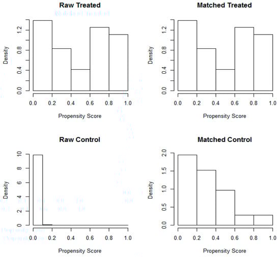 Next, to visualize the match procedure, we presented two lines of code in Figure 9. The first line “plot (PSM.out, type = “jitter”)” is for a jitter plot of the distribution of propensity scores. The plot is demonstrated in Figure 10. Each bubble represents an individual student’s propensity score. We can see that, compared with the distribution of unmatched “control” units, the distribution of matched “control” units shared more similarity with the distribution of the matched “treatment” units. The second line in Figure 9, “plot (PSM.out, type = “hist”)”, is the code for histograms before and after matching by the condition. As is demonstrated in Figure 11, the histograms of matched “treatment” and matched “control” are not exactly the same, but they share more similarities than the pair of histograms for raw “treatment” and raw “control”.