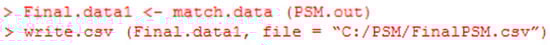 Once the PSM procedure was completed, we created a data set that only matched cases. The first line in Figure 12, “Final.data1 <- match.data (PSM.out)”, is the code for creating an R dataset named “Final.data1”. In this study, we had 36 students in treatment, who were then matched with 36 control students. Therefore, we expected 72 matched cases in the dataset “Final.data1”. The second line in Figure 12, “write.csv (Final.data1, file = “C:/PSM/FinalPSM.csv”)”, is the code for exporting this file as a CSV file that can be further analyzed in R or ANother statistical software, e.g., SPSS or STATA. The CSV file was named “FinalPSM.csv” and saved in the folder “PSM” in the C drive.