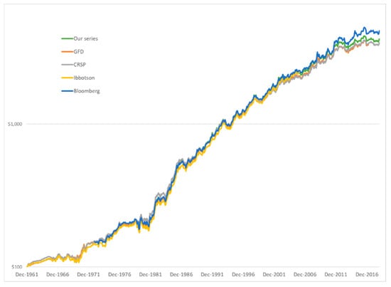 It can be seen that our series is a close match to each of the alternatives, as average returns and risk characteristics are similar. The intercepts of each of the regressions close to zero, and the slope coefficients close to one, with r-squared values above 0.92. Note, however, that the p-values are below 0.05 in several cases, which means that they statistically reject that the series are equal. This is due to the large r-squares, which leads to extremely narrow confidence bounds around the slope coefficient. Hence, even though the coefficients jointly are statistically significantly different from zero and one, they are not economically significantly different. Clearly, the GFD series that is often used in academic research (see, for example, [11,12,13,14]) is extremely close to ours with an r-square of 0.996 over the entire sample period from 1962 to 2018. The closeness of the series is also illustrated in Figure 2, in which we plot the cumulative value of a $100 investment in the Treasury bond at 31 December 1961. We see that the data series are so close that for many periods the lines overlap. Therefore, researchers without access to commercial data providers may use our data series and obtain very similar results to researchers with access.