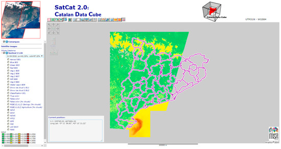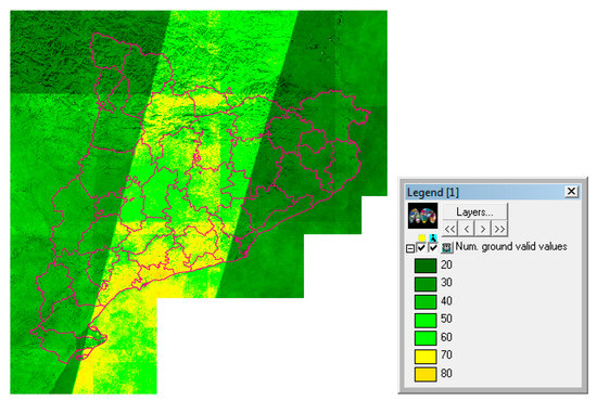 Sentinel 2 level 2A product generated and distributed by ESA incorporates a categorical band (Scene Classification map, SCL) that classifies the pixels of each image in 12 classes (using L2A_SceneClass algorithm3). This is particularly useful to estimate if a pixel actually represents the ground or is not very meaningful because it is a missing value, a saturated pixel, or it is covered by clouds, shadows, etc. In the map browser, it is possible to generate a dynamic band that reclassifies all categories that represent a valid value for “ground” (i.e., vegetation, non-vegetated—i.e., bare ground—, water and snow or ice) as a single category. This virtual band will be dynamically computed for all time scenes when needed. Then, in the temporal analysis window, we will be able to see the temporal evolution of this category as well as to generate an image representing the number of scenes that contain the “ground” category (see Figure 5b). Due to the swath of the Sentinel 2A and B, many scenes partially cover the Catalan territory, a situation that is modulated by the cloud presence, which is more frequent in some regions. The image gives us the actual level of Sentinel 2 imagery recurrence for each part of Catalonia (see Figure 6).