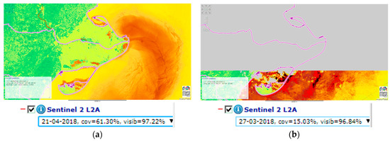 Two scenes offered in the Catalan Data Cube map browser and how they are shown in the table of contents (legend): (a) scene offers less coverage than (b) scene (as can be seen in “cov“ percentages), but both scenes have high visibility ("vis" percentage, i.e., the ground is not obscured by clouds) in the covered areas.