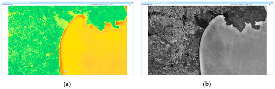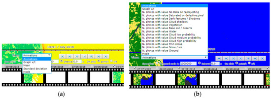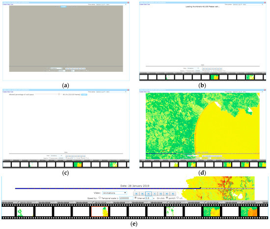 After the user has decided about the accepted percentage of coverage (and presses the Load button), all the WMS GetMap requests at screen resolution start. Once the images have been downloaded and the multidimensional binary array has been completed, an animation begins showing the sequence of scenes (as the “Animation” option, by default, is selected in the dropdown list on the temporal analysis control, as shown in Figure 3e).