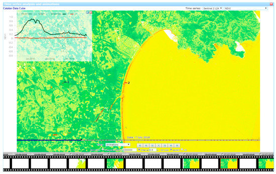 Actually, the ODC provides support for WMS services by using the https://github.com/opendatacube/datacube-ows code. Nevertheless, in this development we wanted to take advantage of a new functionality that we have recently developed in the MiraMon server and map browser for the ECOPotential project: MiraMon implementation of the WMS OGC Web Services serves imagery in JPEG or PNG for standard WMS clients as well as in raw format where the arrays of numeric values (original data) of the cells is transmitted directly to the client (we call it IMG format). The use of a raw numerical format opens a myriad of new possibilities in the client side. Now the map browser JavaScript code is able to request IMG format asynchronously (with AJAX) and get the return as a JavaScript binary array (new characteristic in HTML5). HTML5 also adds support for a graphics library that works on an area of the screen that is called canvas. In the canvas, we can get access to each pixel of the screen area and modify it. Binary arrays are dynamically converted into arrays of RGBA values that will then covering the whole canvas area. The conversion can be as complex as we want, ranging from applying a grey scale color map, creating an RGB combination from 3 bands (3 WMS binary array requests), and up to a complex pixel-to-pixel operation involving several bands and thus many WMS binary array requests [19]. Our CDC WMS client can be accessed at http://datacube.uab.cat/cdc/ (see Figure 1). The description of most of the functionalities implemented in the map browser is out of the scope of this paper that will only focus on the time series analysis.