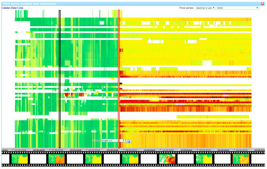 x/t graphic in the Catalan Data Cube. Black and red rectangles show the temporal profile (in vertical starting from above with the first date and ending below with the last date) for the same crop (black) and sand (red) points used in Figure 4.