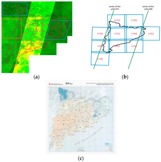Image availability over Catalonia: (a) number of scenes with “Ground” class; (b) orbits distribution over Catalonia; and (c) mean annual rainfall4.