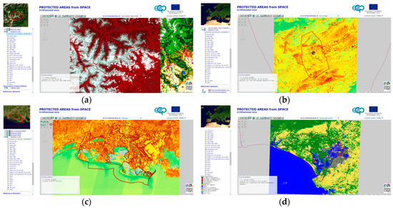 Use of Sentinel 2 images from the ECOPotential Data Cube in the Protected Areas from Space map browser: (a) false color RGB combination over the mountain ecosystem of Gran Paradiso National Park in Italy (in red, highest values of vegetated areas); (b) Soil Adjusted Vegetation Index (SAVI) dynamic calculation over the arid ecosystem of Har Ha Negev National Park in Israel (in green, highest values of SAVI; in brown-orange, lowest values); (c) Leaf Area Index (LAI) dynamic calculation over the coastal ecosystem of the Camargue National Park in France (in green highest values of LAI; in brown-orange, lowest values); and (d) Scene Classification map (SCL) provided by ESA over the coastal ecosystem of Doñana National Park.