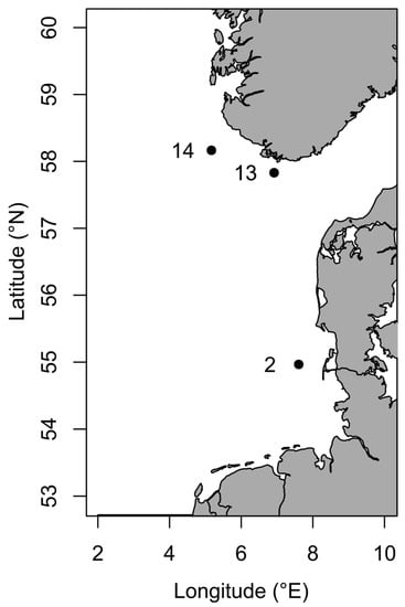 Map of the North Sea showing the three sampling sites. Seawater samples were taken at 3 m (2, 13, 14) and 350 m depth (13). Note that numbering follows ship stations. The map was generated in R using the maps and mapdata packages [3,4,5].