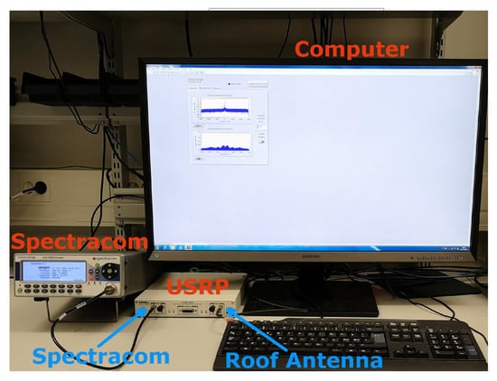 The main parameters used during the recordings and signal generation are summarized in Table 1 and Table 2, for the USRP and the Spectracom, respectively. Table 1 shows that the recordings Sampling Frequency was set to 50 MSamples/s. The quantization bits resolution is chosen relatively high (16 bits) due to the fact that for the further RF FP analysis, high resolution (and also a high sampling rate) data is typically preferred due to the higher amount of information that can be processed in order to extract a higher number (or more accurate) FP features. Each recording was chosen to be about 20 s duration, in order to fulfill the trade-off of having enough data to process and keeping a file size relatively low. No IF frequency was used during the recordings, all recordings were carried out directly in baseband. The USRP power amplifier gain was set to 30 dB, in order to record the signal with enough power (especially the one coming from the roof antennas, which was considerably attenuated due to propagation).