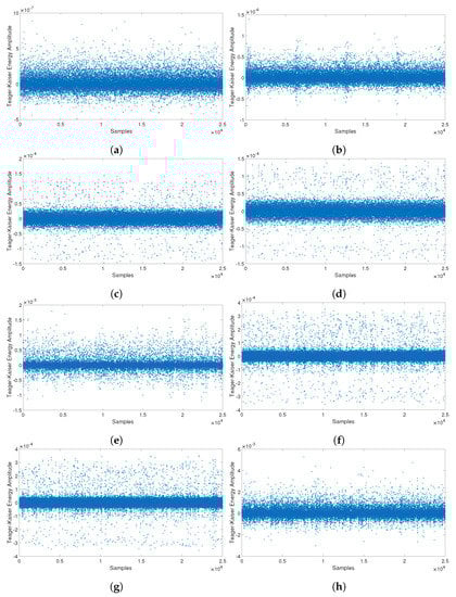 Figure 3 shows snapshot examples of TKEO plot for each considered scenario from Table 4, where the Teager-Kaiser (TK) energy is depicted for each sample. Small differences between different scenarios are visible by eye, but it is to be emphasized that the images shown in Figure 3 are only snapshot images, while the machine learning classifier will use a large amount of such images to be able to identify a certain scenario.