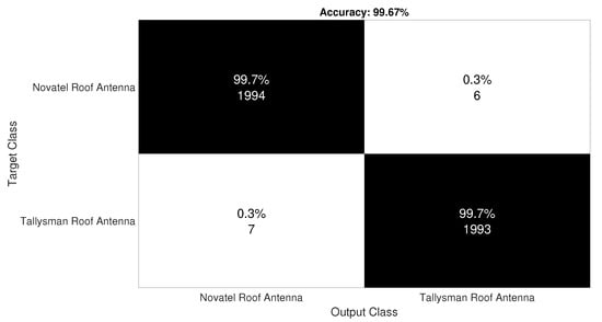 The confusion matrix shows how accurate a classifier is, in terms of how well it classifies and miss-classifies the test data set into the different classes it has. In our examples, we have split the simulations into two parts, namely a classification based on two classes with roof-antenna signals (Figure 4) and a classification based on six classes with Spectracom-generated signals (Figure 5). This was done in order to can compare the results fairly in similar conditions (e.g., noise, power, etc.).