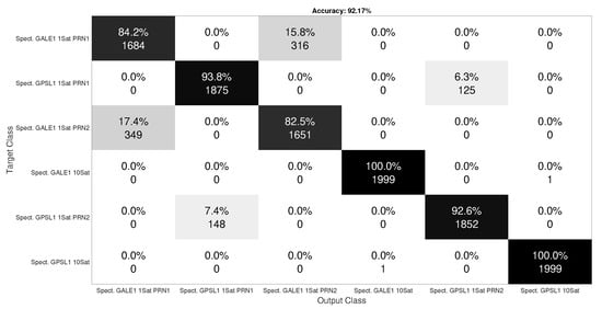 Regarding Spectracom-generated data, the confusion matrix-results are depicted in Figure 5. In this case, the average accuracy is lower than using real/roof-antenna data, but it is still more than 92%. Scenarios with 10 different satellites can be perfectly classified (100% accuracy). It means that the classifier can differentiate between signals with a single satellite and several satellites given the same signal structure (namely Global Positioning System (GPS) or Galileo).