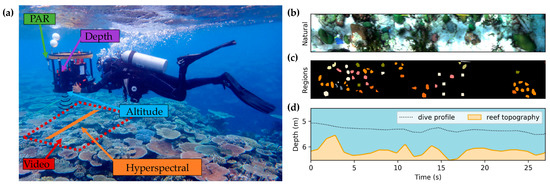 (a) The HyperDiver during an underwater survey of a coral reef transect. Sensors collect hyperspectral images, altitude, depth and irradiance. (b) Three-channel ‘natural’ view of the surveyed transect area derived from hyperspectral data. (c) Class map showing colored polygons that correspond to annotated regions-of-interest. (d) Depth and altitude information were used to generate the altitude and topographic profile of the transect.